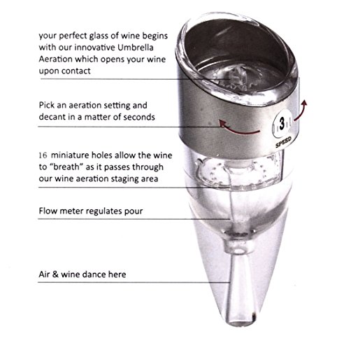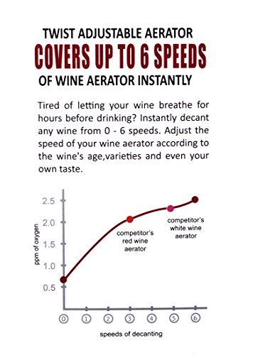 -. Feature : 0-6 SPEEDS OF WINE AERATOR INSTANTLY-Itantly decant any wine from 0-6 speeds. Adjust the speed of your wine aerator according to the wine's age,varieties and even your own taste. / SAY GOODBYE TO BREATHING,AERATE WINES IN SECONDS, NO WAIT!-Tired of letting your wine breathe for hours before driking? No wait to drink your favorite wine now. With this cutting edge Patented Multi-Stage Aeration Tool ,our Wine Aerator releases the wine's flavor and aromas in the time it takes to pour a glass. / POUR YOUR WINE DRIP FREE & HOST IN STYLE- Never worry about your wine dripping from the bottle after each pour. Our wine aerator significantly reduces any drips after your pour a glass of wine with the drip free pour spout. Don't serve red wines straight from the bottle. Utilize this instant wine aerator to show a touch of class and sophistication, thus getting your guests asking about your wine aerator. / ENHANCED FLAVOR, YOUR WINE WILL TASTE SIGNIFICANTLY BETTER - Opens up the aromas and softens wine right out of the bottle, Stimulates the oxidation processes which triggers the release of more aromatic compounds. Enjoy a much richer bouquet, fully enhanced flavor, and a much smoother finish. Very noticeable difference in the taste of the wine when using the aerator versus the glass of wine straight out of the bottle. / 100% LIFETIME MONEY BACK GUARANTEE-If you purchase today and for whatever reason are not satisfied with your wine aerator, simply return and we will refund your money, no questions asked. We are that confident in our wine aerator.