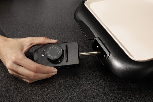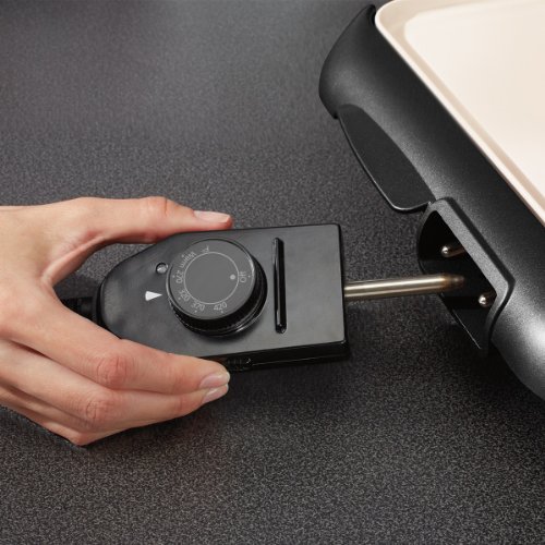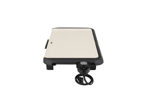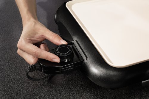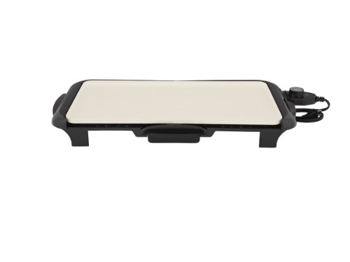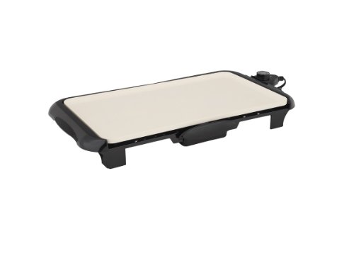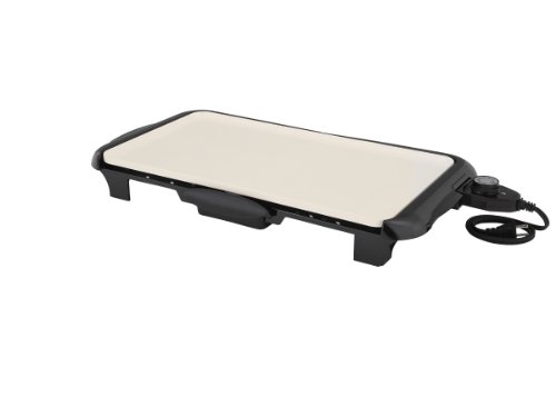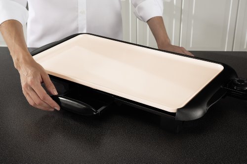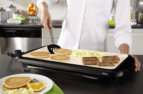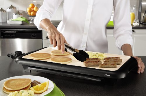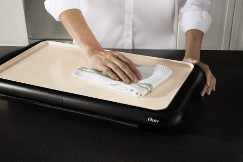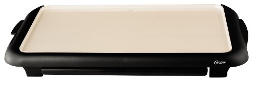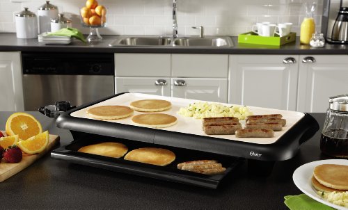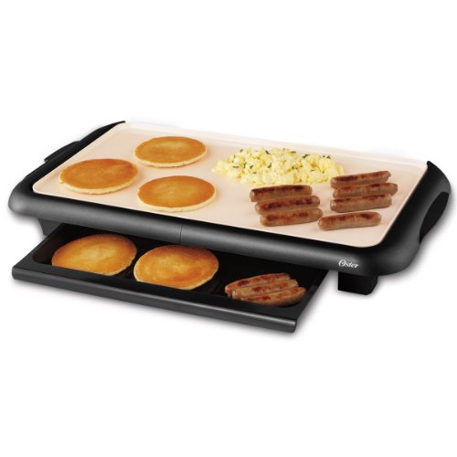 The Oster Countertop Griddle is designed with unique, innovative Titanium Infused DuraCeramic: non-stick ceramic coating to last 8 times longer than ordinary non-stick surfaces. This extra-durable, super-hard surface won't flake or peel. Natural Titanium Infused DuraCeramic is PFOA and PTFE free and cooks up to 30% faster to save time and energy. Convenient warming tray keeps food at ideal serving temperature.Feature