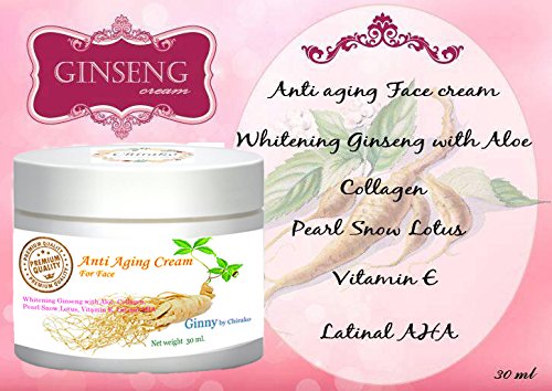 -. Feature : 30 ml / Anti aging Face cream Whitening Ginseng with Aloe, Collagen, / Pearl Snow Lotus, Vitamin E, Latinal AHA / How to use : Wash your face. Everytime befor putting makeup, in morning and befor going to bed, throughout your entire face and neck. / Quantity : 1 pcs.