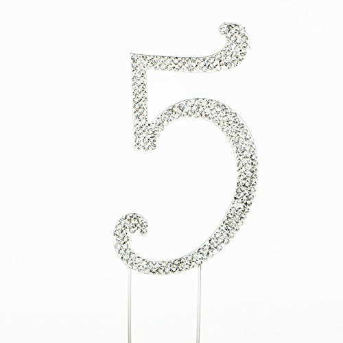 Number 5 Rhinestone Jeweled Cake Topper, 4" Tall Numeral Five, Silver Metal, Silver