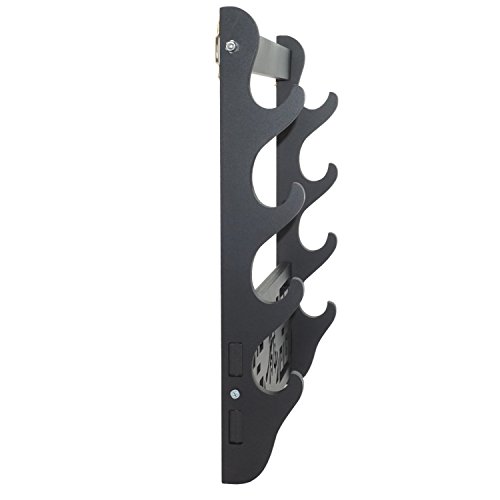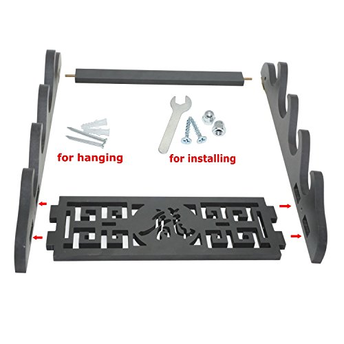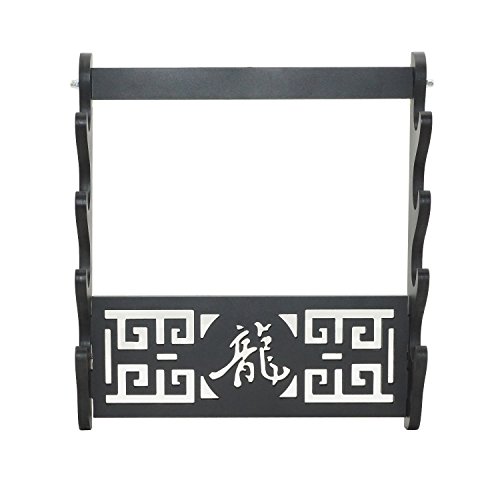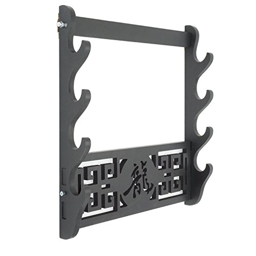 Color: All black. Material: Compressed wood. Decent and sturdy wall mount stand rack for your swords display.