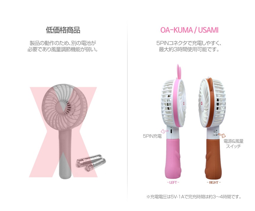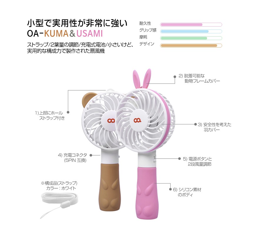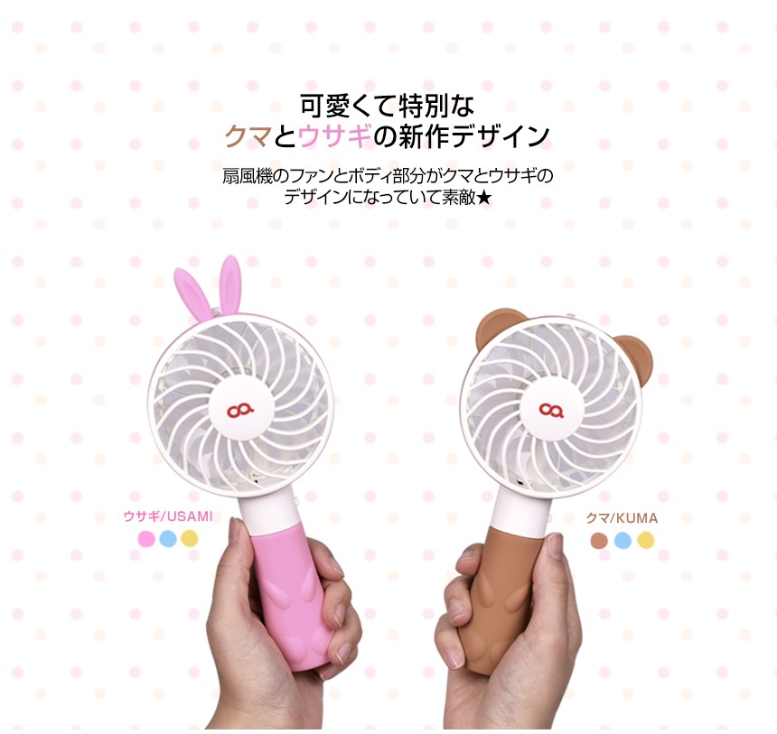 | 商品名 | USB 扇風機 携帯 【KUMA&USAMI】 バッテリー一体型 クリップ 電池不要 かわいい 5PIN 2段風量 ストラップ付き USB シリコン ミニ 小型 充電 事務所 大容量 夏 |