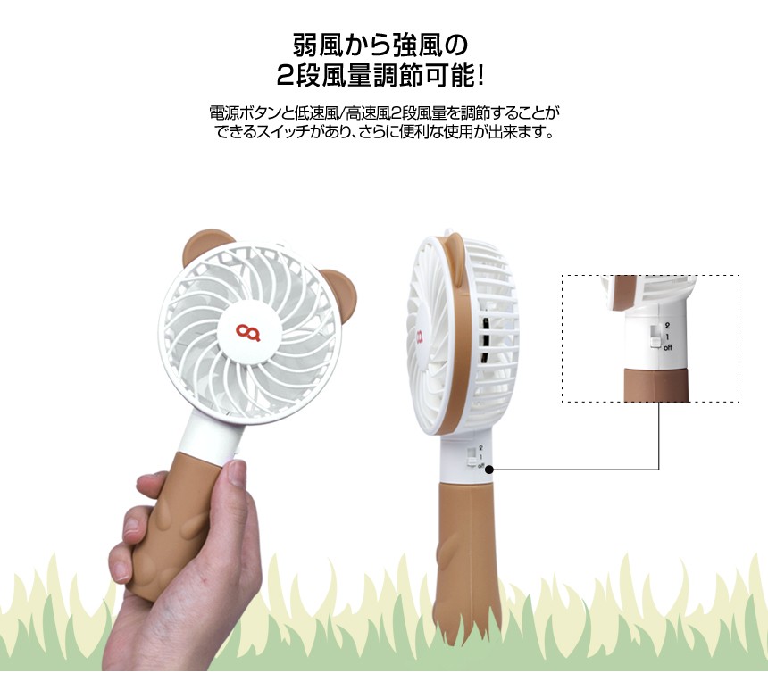 | 商品説明 | クマとウサギデザインと3つのカラーに構成されてるかわいい&便利な扇風機! 弱風から強風の2段風量調節可能! |