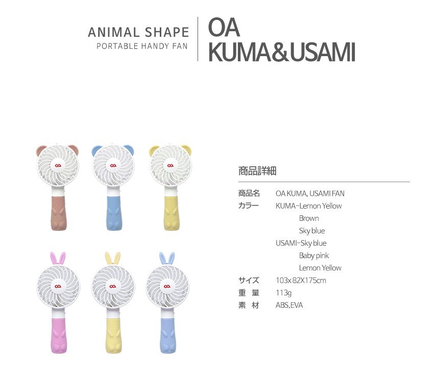 | カラー | KUMA-Lemon Yellow Brown Sky blue USAMI-Sky blue Baby pink Lemon Yellow |