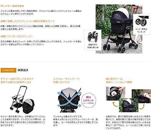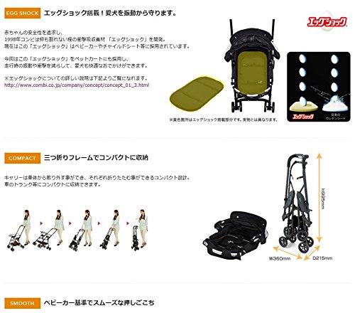 赤ちゃんの安全性を追求し、1998年コンビは卵も割れない程の衝撃吸収素材 「エッグショック」を開発。現在はこの「エッグショック」はベビーカーやチャイルドシート等に採用されています。今回はこの「エッグショック」をペットカートにも採用し、走行時の振動や衝撃を減らして、愛犬も快適なおでかけができます 三つ折りフレームでコンパクトに収納 キャリーは車体から取り外す事ができ、それぞれ折りたたむ事ができるコンパクト設計。車のトランク等にコンパクトに収納できます。 ベビーカー基準でスムーズな押しごこち 押しやすい高剛性車体 ミリミリの車体は押しやすい高剛性車体、アルミニウム製のしっかりしたフレーム構造なのでスムーズに押すことができます。 車輪に搭載したサスペンション機能が振動をカット 前輪・後輪の両方にサスペンション機能を搭載。路面からの振動 を吸収し、愛犬の快適な乗り心地を実現します。後輪にワンタッチのストッパー 左右の後輪にあるストッパーを押し下げれば簡単にロックできます。ペットカートを停止させている間は必ずロック状態にしてください。 キャリー部分を取り外し、お部屋などでハウスとしても使用できます。ドッグカフェや車の中、お泊まりのときでも愛犬が安心できる空間を作ってあげられます。ワンちゃんは暑さがにがてです。前後4ヵ所になったエアスルーウインドーは、風を通し、カート内の熱をにがすので快適にすごせます。お散歩では、愛犬が景色を楽しめるように前面を開けたり、背面を開けて愛犬の様子を見たりできます。Feature