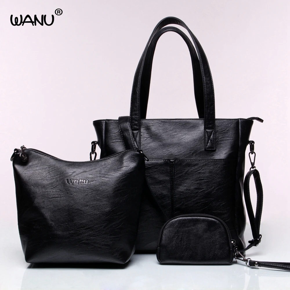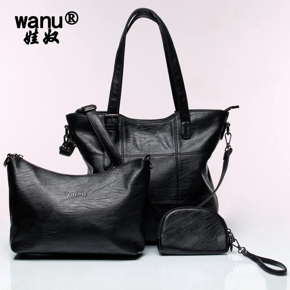 WANU Leather Luxury Handbags Women Shoulder Bags High Quality Crossbody Bags Casual Black Bag for Women Female Ladies --3 Bags