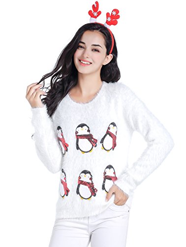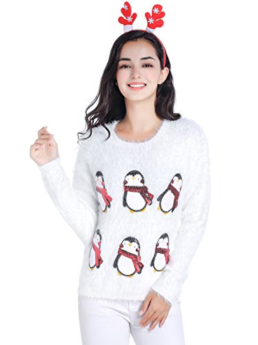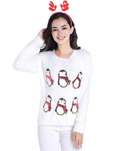 v28 Ugly Christmas Sweater, Women Ladies Girl Xmas Shining Santa Penguin Jumper (X-Large, CutePenguin White)
