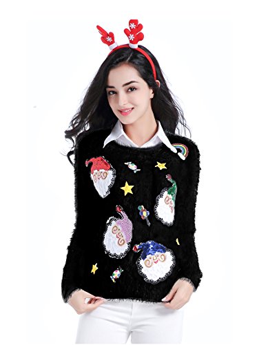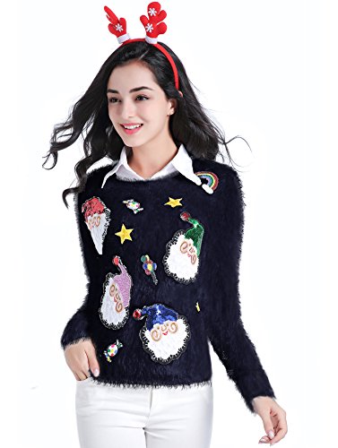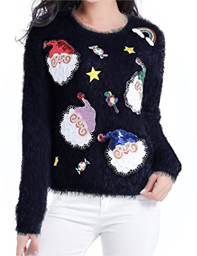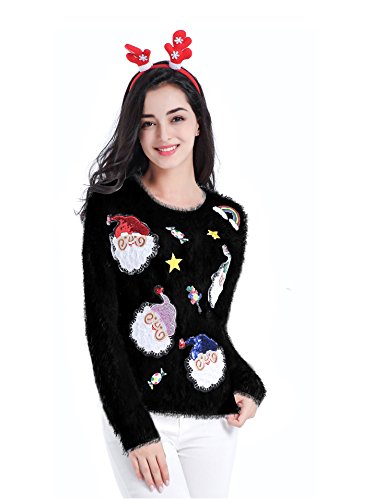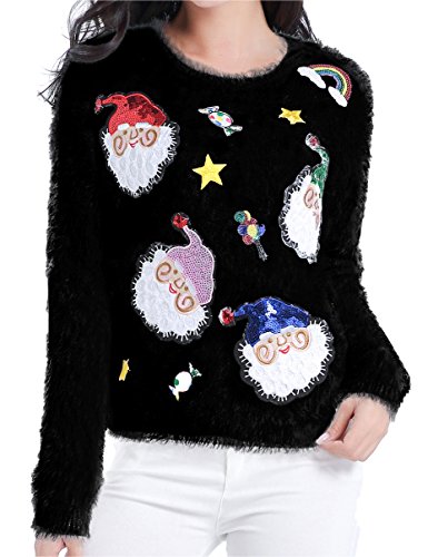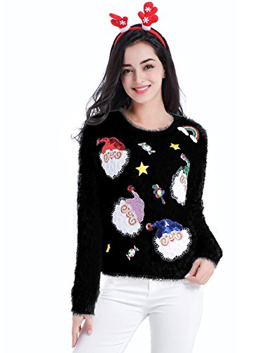 v28 Ugly Christmas Sweater, Women Ladies Girl Xmas Shining Santa Penguin Jumper (Medium, ShiningSanta Black)