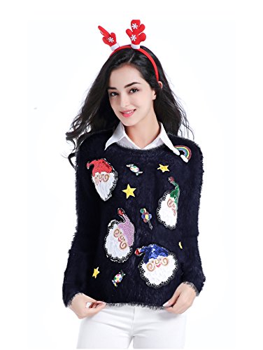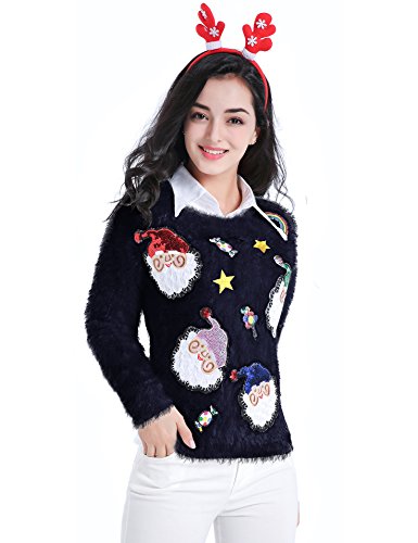 v28 Ugly Christmas Sweater, Women Ladies Girl Xmas Shining Santa Penguin Jumper (Medium, ShiningSanta Navy)