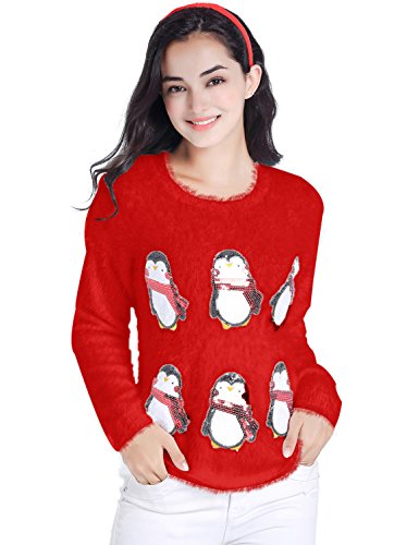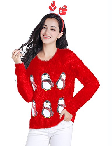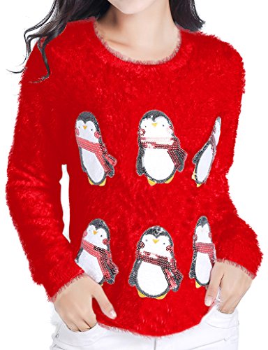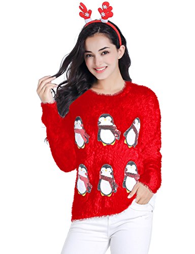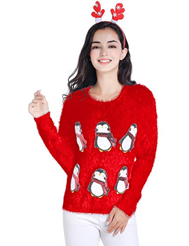 v28 Ugly Christmas Sweater, Women Ladies Girl Xmas Shining Santa Penguin Jumper (Large, CutePenguin Red)