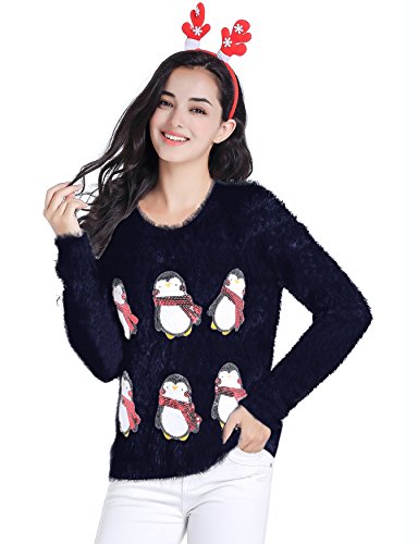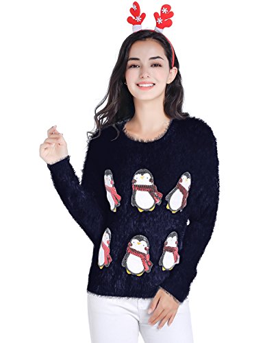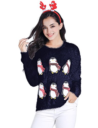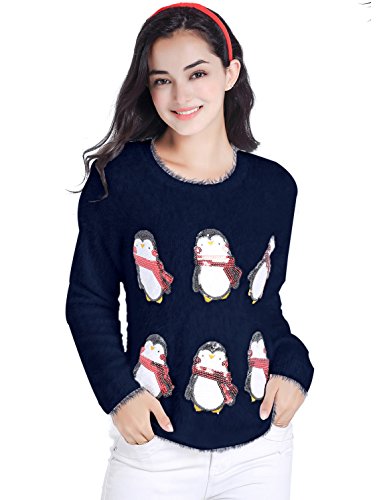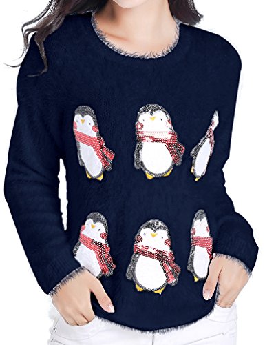 v28 Ugly Christmas Sweater, Women Ladies Girl Xmas Shining Santa Penguin Jumper (Large, CutePenguin Navy)