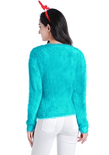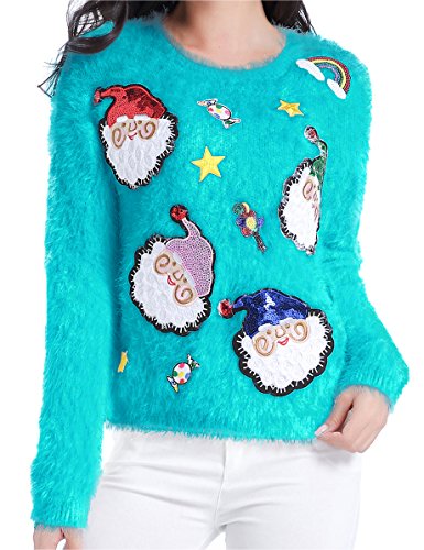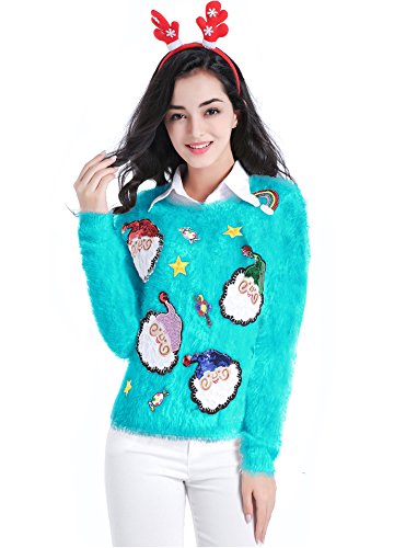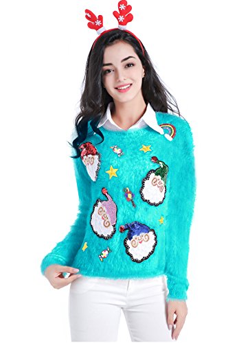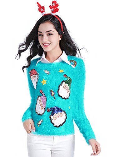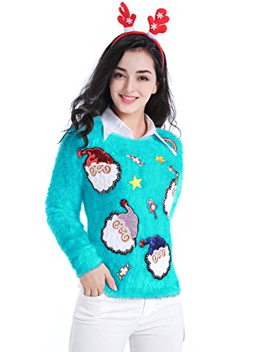 v28 Ugly Christmas Sweater, Women Ladies Girl Xmas Shining Santa Penguin Jumper (Large, ShiningSanta LakeBlue)
