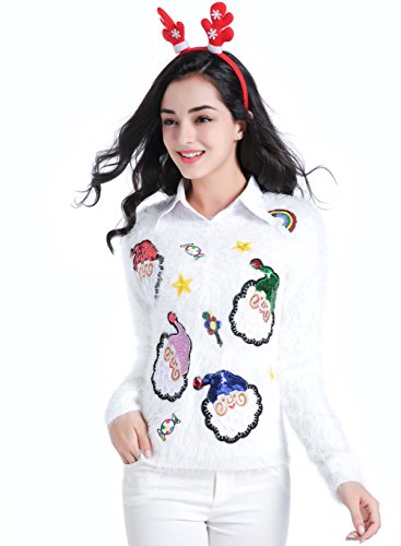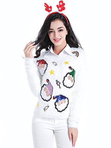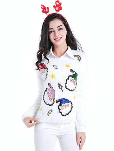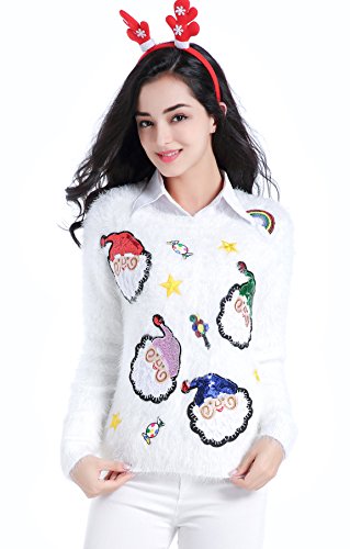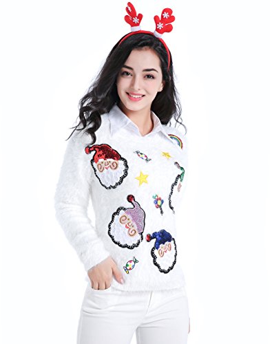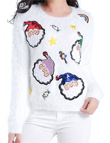 v28 Ugly Christmas Sweater, Women Ladies Girl Xmas Shining Santa Penguin Jumper (Medium, ShiningSanta White)