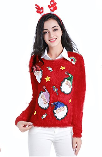 v28 Ugly Christmas Sweater, Women Ladies Girl Xmas Shining Santa Penguin Jumper (X-Large, ShiningSanta Red)