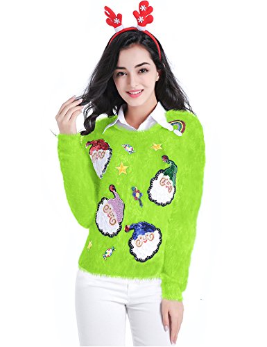 v28 Ugly Christmas Sweater, Women Ladies Girl Xmas Shining Santa Penguin Jumper (X-Large, ShiningSanta Black)