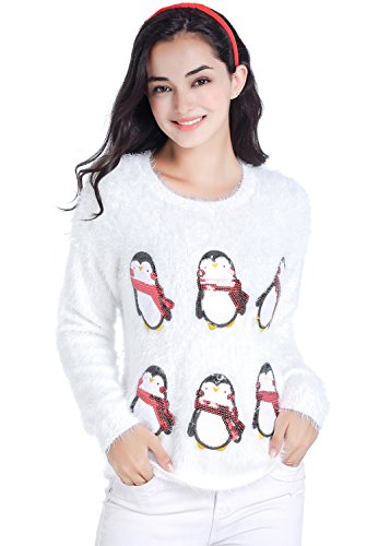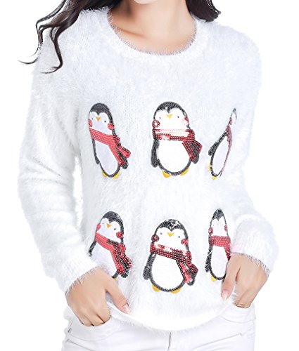 v28 Ugly Christmas Sweater, Women Ladies Girl Xmas Shining Santa Penguin Jumper (Large, CutePenguin White)