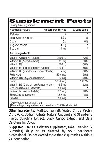 With a formula that includes vitamins A, C, D3, E, B6, B12, and B5, as well as folic acid, biotin, choline, iodine, zinc, and inositol, these gummies are a more complete nutrition solution than almost any other comparable supplement.