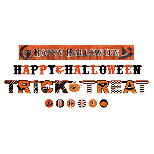 Features an assortment of foil and paper banners in trendy orange and black styles