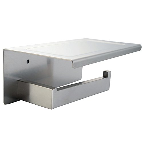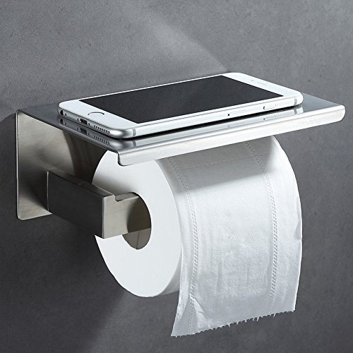- CONTEMPORARY & FUNCTIONAL ALTERNATIVe: this sticky toilet paper holder with shelf is an upgrade to any style of bathroom, you're able to hang the tissue roll below and putting the cell phone on the top shelf, the double utility makes it very practical.