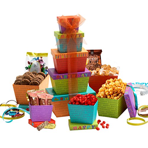 -. Feature : This Happy Birthday gift tower includes almond roca butter crunch, chocolate chip cookies, soft vanilla apple caramels, gourmet caramel popcorn, and much more! All packed away in this birthday themed gift tower that will make that special day - even greater! / Perfect gift basket for family and friends, or as a corporate office gift. / Gift tower includes: Almond Roca Butter Crunch, Lemonade Chews, French Roasted Peanuts, Caramel Apple Kisses, Sea Salt Brownie Brittle, Assorted Milk Toffees, Chocolate Chip Cookies, Gourmet Caramel Popcorn / GIFT TOWER DIMENSIONS: 6.5" x 4" x 14" high / Kosher Certified OK D. Giving a kosher gift ensures that all recipients can enjoy and partake in your gift.