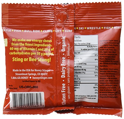 -. Binding : Health and Beauty -. Brand : Honey Stinger -. Department : Cycling -. EAN : 0810815020823 -. Feature : Enter your model number / Above to make sure this fits / Formulated specifically for health-conscious individuals and athletes / Unique as they are the first to include naturally occurring fiber and protein / 100% organic tapioca syrup and honey -. IsAdultProduct : 0 -. Label : Getting Fit (HPC) -. Manufacturer : Getting Fit (HPC) -. MPN : 157362-5 -. NumberOfItems : 1 -. PackageQuantity : 1 -. PartNumber : 157362-5 -. ProductGroup : Health and Beauty -. ProductTypeName : HEALTH_PERSONAL_CARE -. PublicationDate : 2016-01-24 -. Publisher : Getting Fit (HPC) -. ReleaseDate : 2016-01-21 -. Studio : Getting Fit (HPC) -. Title : Honey Stinger Organic Energy Chews, Fruit Smoothie, 1.8-Ounce Bags (Pack of 12) -. UPC : 810815020823