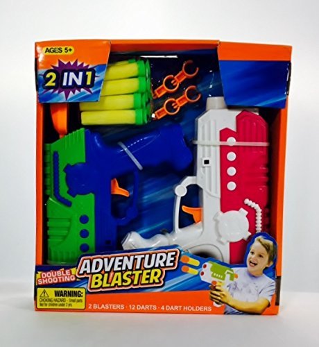 -. Feature : Adventure Blasters come with 4 dart holders mounted for easy re-loading / Double shooting action with 2 darts per fire / Bright colors to identify them as toys / Includes: 2 blaster guns, 12 foam darts, 4 dart holders