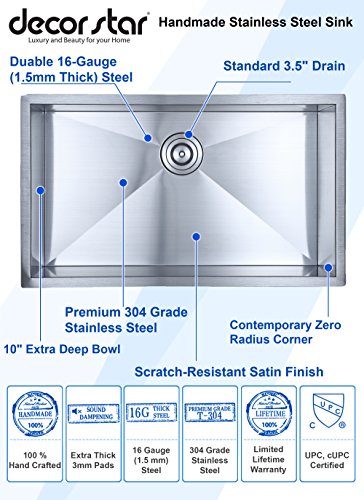 Decor Star H-001-Z 32 Inch x 19 Inch Undermount Single Bowl 16 Gauge Stainless Steel Luxury Handmade Kitchen Sink cUPC Zero Radius