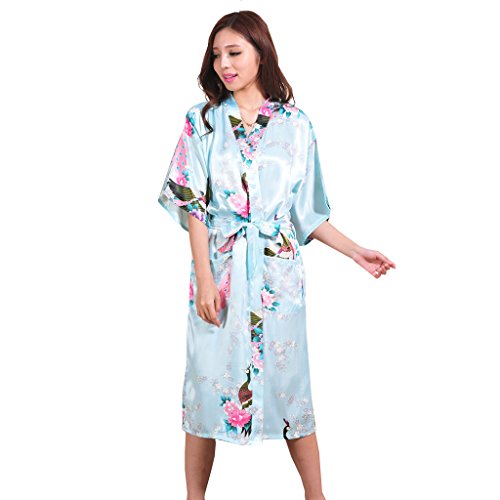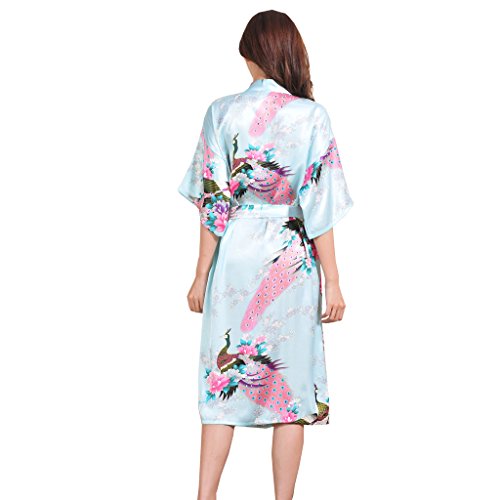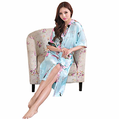 Yidarton Womens Long Fashion Kimono Robe with Peacock and Blossoms Light Blue Medium