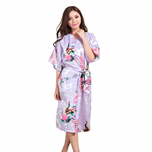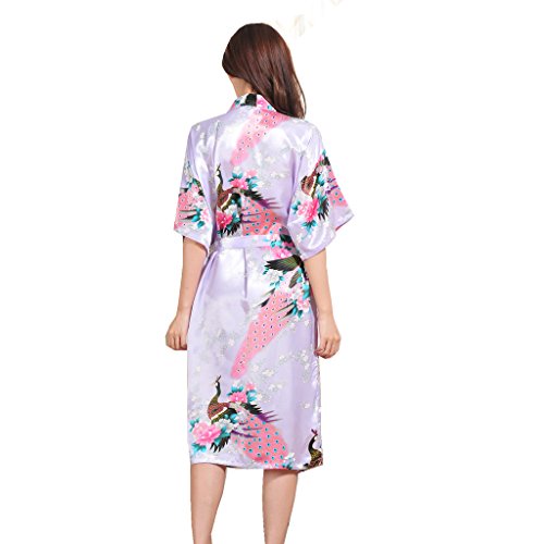 Yidarton Womens Long Fashion Kimono Robe with Peacock and Blossoms Light Purple Medium