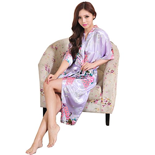 Yidarton Womens Long Fashion Kimono Robe with Peacock and Blossoms Light Purple Large