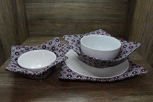 Product Description Microwave cozy set includes 1 small bowl cozy (Approx 6.5" sq), 1 medium bowl cozy (Approx 8" sq), 1 dinner plate cozy (Approx 10" sq.) The dinner plate cozy can also be used for round casserole dishes and the small size is great for coffee mugs! These microwave cozies are the perfect solution to handling super-hot dishes. Cooking and reheating food in a dish cozy makes life so much easier! Place your microwaveable dish inside the bowl cozy and put the whole thing in the microwave to heat. To take the bowl out, you simply grab the corners of the cozy. We found that our kids can now get their dishes out of the microwave safely. Cozies will also protect your fingers from the cold when holding a bowl of ice cream and are great for protecting your table. You can also use a cozy placed on top the dish you are microwaving to help steam food. MATERIALS: * 100% cotton fabric * 2 layers of 100% cotton batting * 100% cotton thread Please be advised: Bowl cozies must only be used in microwaves with a rotating base. To avoid scorching or burning, please make sure cozy freely rotates in your microwave. Never leave microwave unattended. Make sure cozy is clean with no pieces of food attached. Do not microwave cozy for more than three minutes. Cozies can be machine washed on delicate cycle. Reshape and allow to air dry for best results. Please let us know if this is a gift, and we will ship without a packing slip enclosed! #bowlcozy #microwaveable #handmadeatamazon #hot4handmade #buyhandmade 0