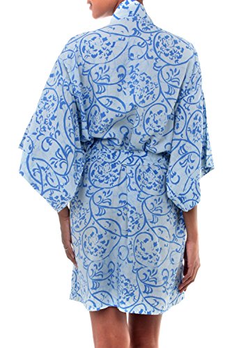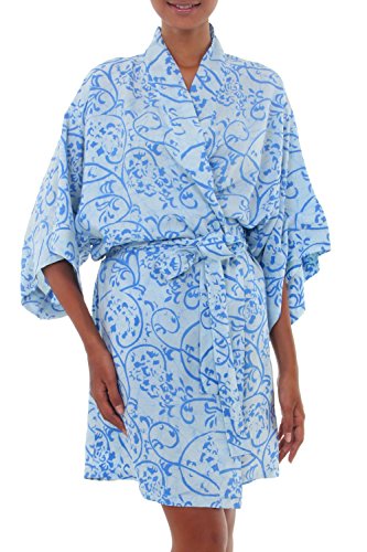 About this item: Sea currents swirl on a soft blue robe. Designed by Arthur Karvan, the motifs are created by hand with traditional batik techniques. The short robe features 3/4 length sleeves, and wraps and ties with a belt. Due to the nature of the technique, no two pieces are ever identical, as the coloring process depends in part on the brightness of the sun. - Hand wash separately in cold water