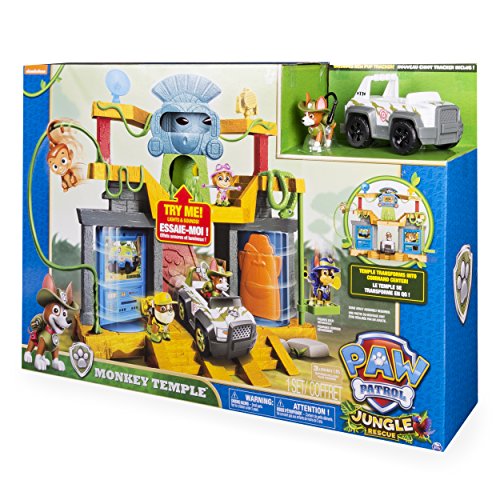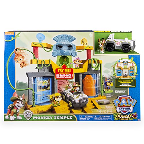 -. Binding : Toy -. Brand : Paw Patrol -. Color : Apple Green,Silver,Vibrant Yellow -. EAN : 0778988231111 -. Feature : The Monkey Temple features real lights and sounds, a trap door and the new pup Tracker! / The temple easily transforms into a pup command center to send you on your next rescue missions! / Collect all of the Paw Patrol Jungle Rescue figures and vehicles for even more fun! Each sold separately. / The Monkey Temple Playset is for ages 3+ and requires 3 LR44 batteries (included). -. IsAdultProduct : 0 -. Label : Spin Master -. Manufacturer : Spin Master -. Model : 6028066 -. MPN : 6028066-6033997 -. PackageQuantity : 1 -. PartNumber : 6028066-6033997 -. ProductGroup : Toy -. ProductTypeName : TOYS_AND_GAMES -. Publisher : Spin Master -. ReleaseDate : 2015-08-01 -. Size : Standard -. Studio : Spin Master -. Title : Paw Patrol - Monkey Temple Playset -. UPC : 778988231111 -. Warranty : No Warranty