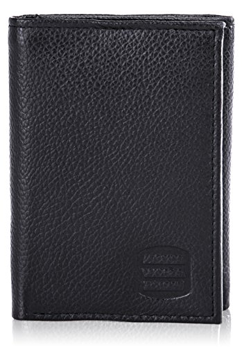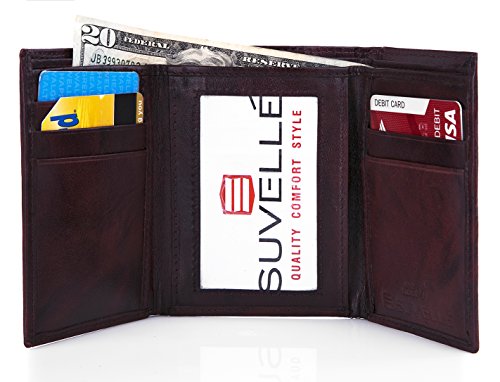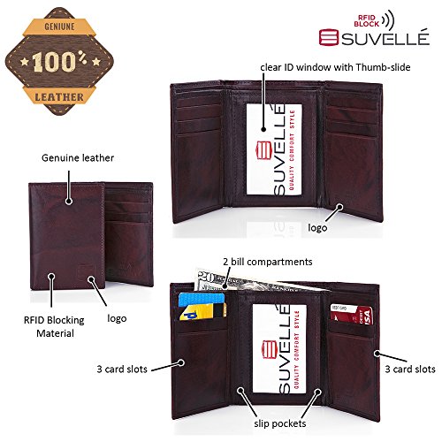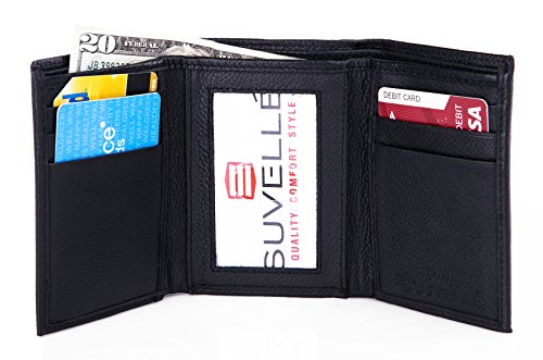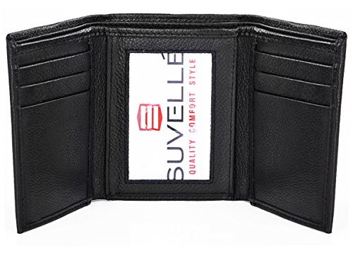 -. Binding : Apparel -. Brand : Suvelle -. Department : mens -. Feature : RFID PROTECTION: Protect your information from hackers with this sleek Suvelle RFID trifold wallet. The rich leather wallet features a RFID blocking material that shields all around the wallet and blocks radio frequencies embedded in your credit cards and ID's from unwanted scans / ORGANIZED INTERIOR: Interior features a clear ID window to display your driver's license or photo ID with a thumb-slide to get your ID in and out with ease, 6 business or credit card slots 3 on each side of the fold and 2 slip pockets 1 on each side behind the card slots are perfect places to hold pictures and slips, 2 bill compartments helps split larger bills from smaller ones easily or perfect for receipts and important notes you want to bring along / MADE IN SOFT GENUINE LEATHER: Embossed Suvelle logo at the front and at the interior offers a subtle touch of brand identification and a single- needle stitching featuring around the perimeter for the finishing touch / STYLISH & SLIMFOLD DESIGN: The slim trifold wallet offers fashion and function ideal for everyday or travel use and ensures comfortable carrying in any pocket, yet holds everything you'll need without the bulge / AVAILABLE IN FINE BLACK AND BROWN COLORS: Black fine grain leather and Brown antique marbleized leather, Approximate Dimensions: when closed 3 ½ W X 4 ½ L when open 9 ½ W X 4 ½ L -. ProductGroup : Apparel -. ProductTypeName : ACCESSORY -. Size : Large -. Title : Suvelle Trifold Men's Genuine Leather RFID Wallets, Slim Travel Wallet
