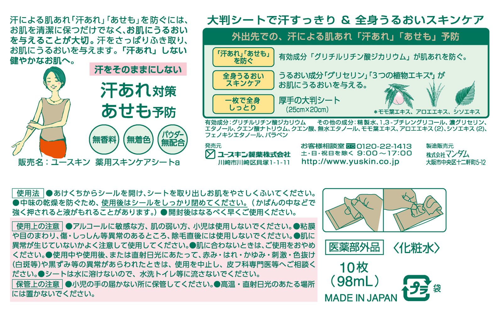 It is a medicated skin care sheet that prevents "sweat" and "heat rash" while sweating on the go.