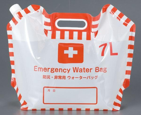| 断水時や災害時に便利なウォーターバッグ。7Lの大容量サイズですが、折りたためばとってもコンパクト。一般的な非常持出袋などにスッポリ入るサイズになります。 |