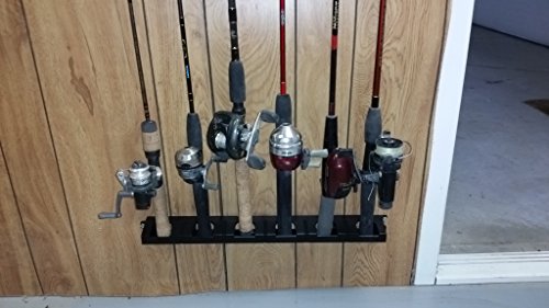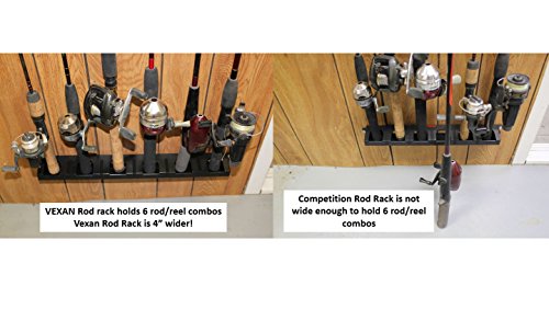 -. Feature : Vexan Super 6 Rod Rack is 4" wider than the competition. It will hold 6 rod/reel combos perfectly! / Built to hold 6 rod/reel combos / Comes with 6 screws and if needed 6 drywall screws as well / Perfect for Bass, Walleye, Crappie, In-shore, Musky, Pike Saltwater rods and more / Screw holes are 19.75" from center to center for attaching to wall or drywall
