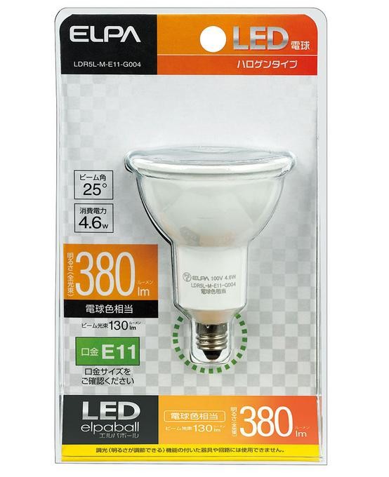 | 仕様 | ■光色:電球色相当 ■口金:E11 ■定格消費電力:4.6W ■定格入力電流:85mA ■定格寿命:約40000時間 ■全光束:380lm ■ビーム角:25度 ■ビーム光束:130lm ■中心光度:1100cd ■交流電源100V 50/60Hz共用 ■屋内用 |
