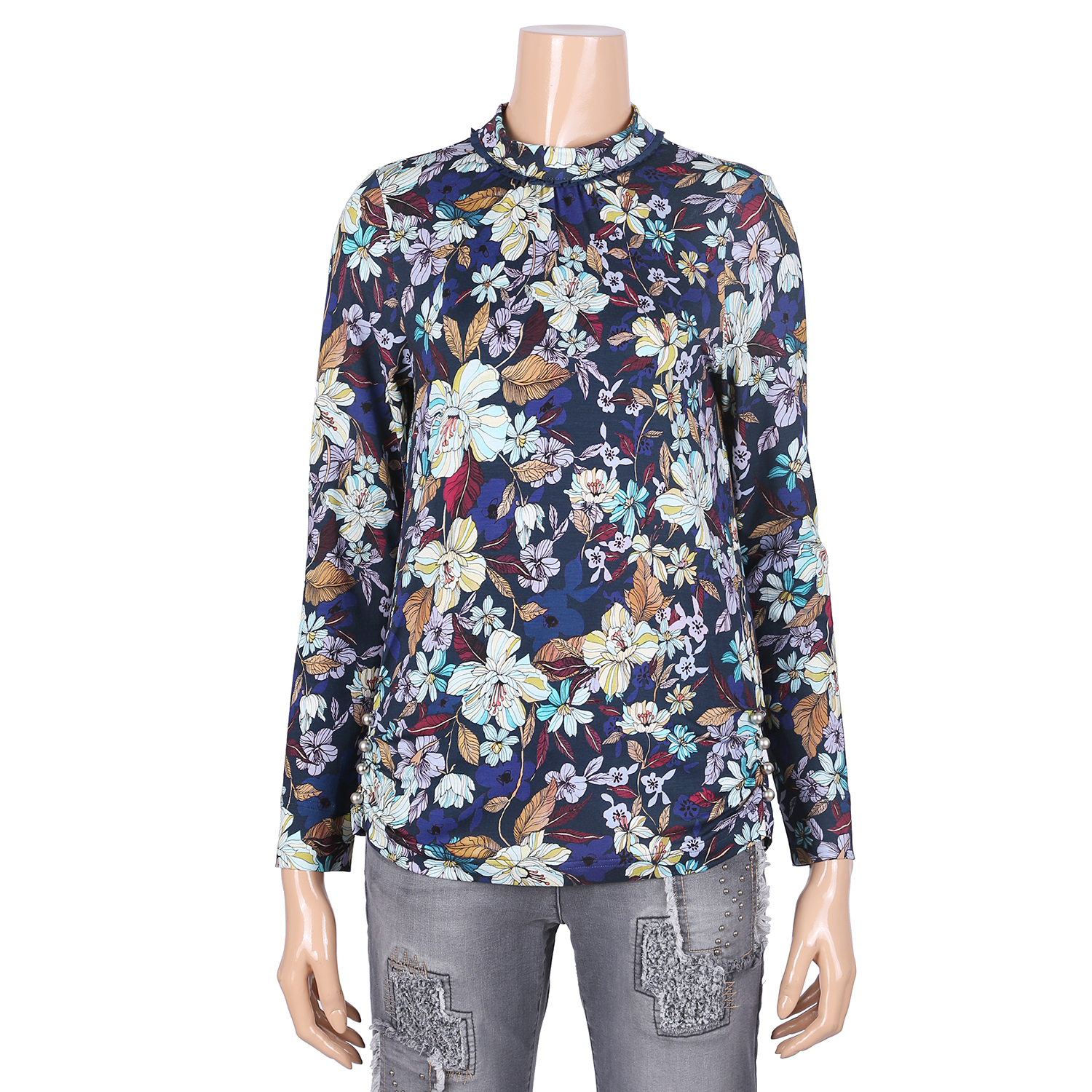 옆선의 진주장식과 주름 포인트로 매우 고급스럽고 케쥬얼스러우며 꽃무늬프린트의 화사함과 세련됨이 더욱 돋 보이며