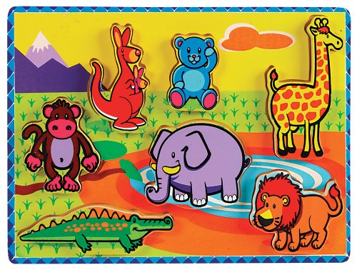 Your toddler will return again and again to the Animals Puzzle from the Small World Toys Ryan's Room collection. Designed especially for early learners, this wooden puzzle features colorful images that help children learn to group like items and expand their vocabulary. The thick pieces are shaped like familiar animals and have wooden knobs that are easy for little hands to grasp, remove and replace. The Small World Ryan's Room collection inspires discovery and imagination, fostering valuable developmental skills kids will use for a lifetime. We call it play with a purpose - kids just call it fun. Small World Toys has been a leading toy manufacturer for 50 years. We believe that play is an integral and necessary part of a child's development and education. At Small World Toys, we are committed to developing fun, innovative, high quality products for children of all ages.Feature