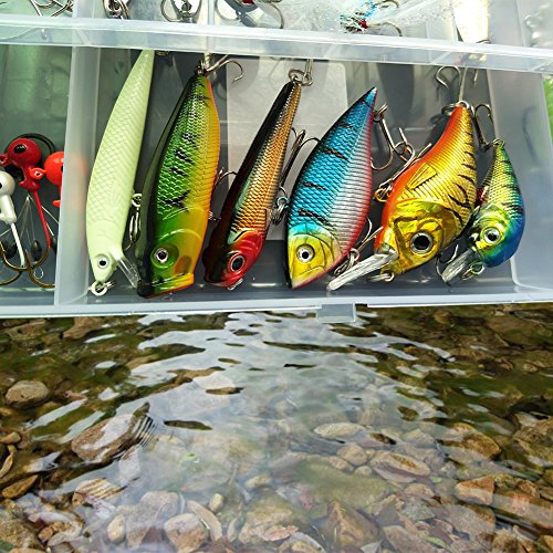 -. Feature : This set contains 6 different baits: All lures are widely used and carefully selected,meet the needs of different varieties of fish you catch.Bouth of them are very lifelike and swim well. / The fishing tackle set collects nearly all accessories that fishing needs,including lures, hooks, Jig Head, Weights Sinker, Line Stopper, Swivel, TackIe Box. With it,you do not need to buy other accessories from other sellers. It's amazing fishing lures set. / The Bionic bait lures and baits are special for fishes 3D eyes. Make fish think the lure is a real fish then you catch them easier. Perfect for ocean boat fishing, ocean rock fishing, ocean beach fishing, lake, river, reservion, pond and stream / Package include - 101pcs Fishing Lure Set.The plastic fishing tackle box is free for you, size is about 21.5cmx11cmx4.3cm. / Compact and easy to take arround. Very good customer service. If any problem, please contact our cusotmer service and we will reply you within 24 hours.