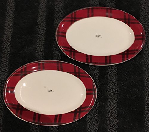Rae Dunn Artisan Collection 2 Piece Set 8" X 5.5" Oval Plates YUM / EAT Typewriter Print with Red Plaid Rim Dishwasher Safe