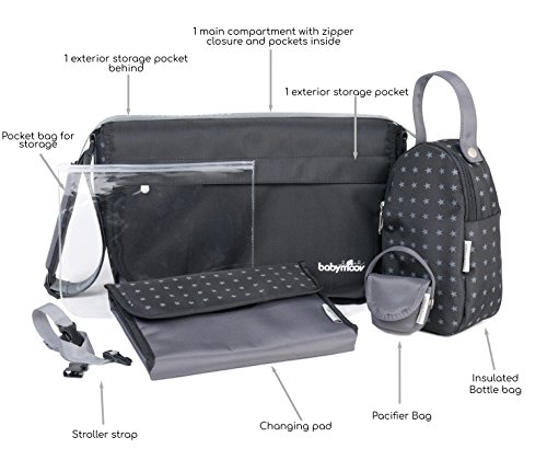 Includes : Changing pad, Stroller strap, insulated bottle bag, pacifier holder, and clear waterproof pouch.