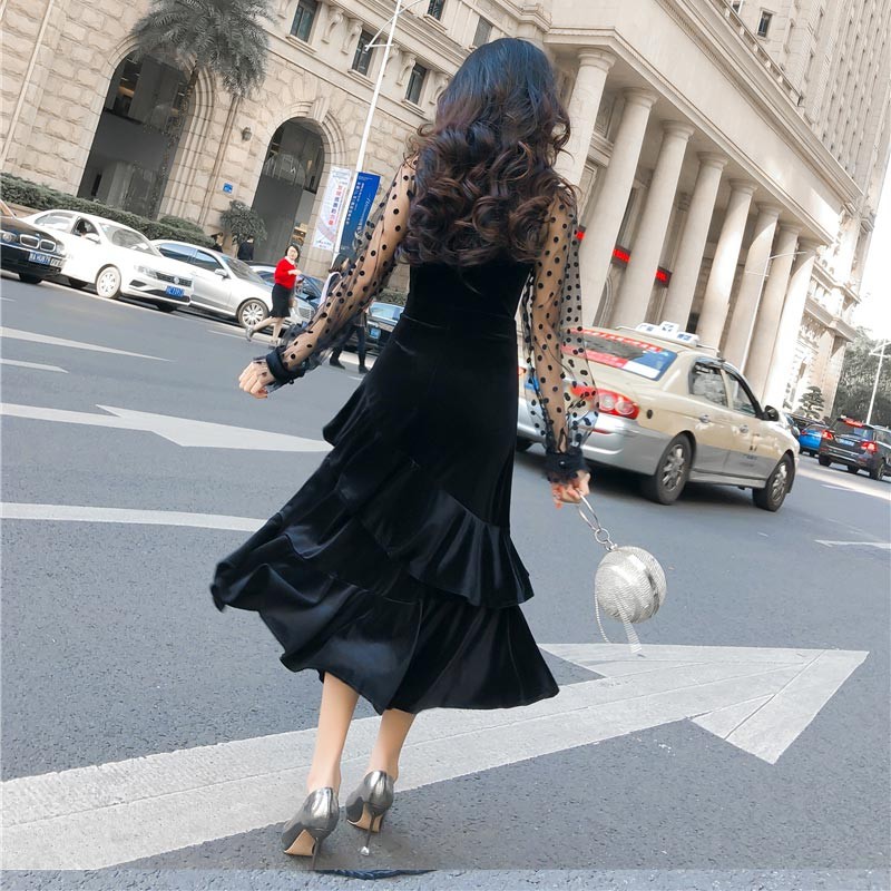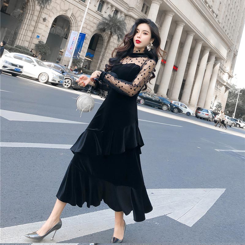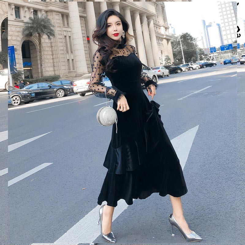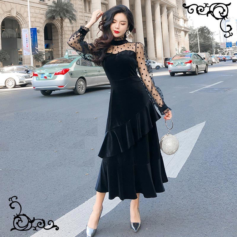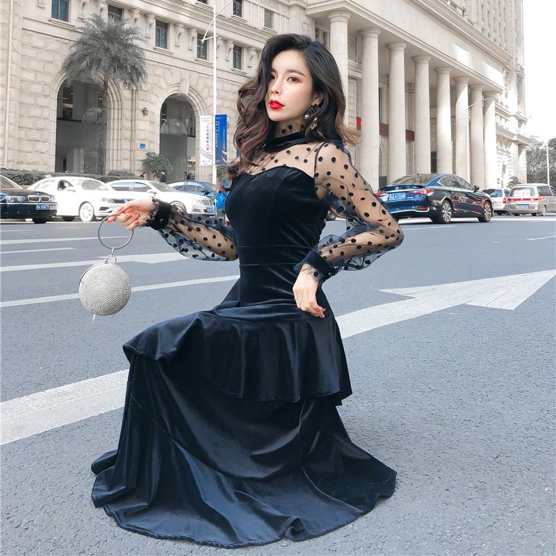 レディライクなショルダーレースデザインのベルベットロングドレス♪