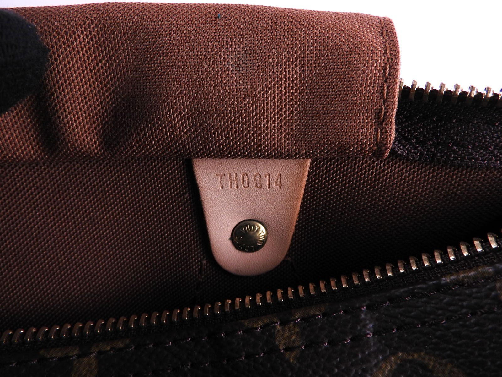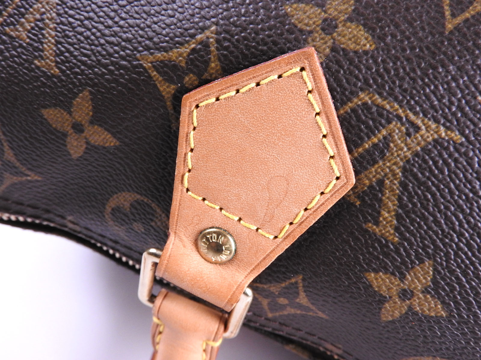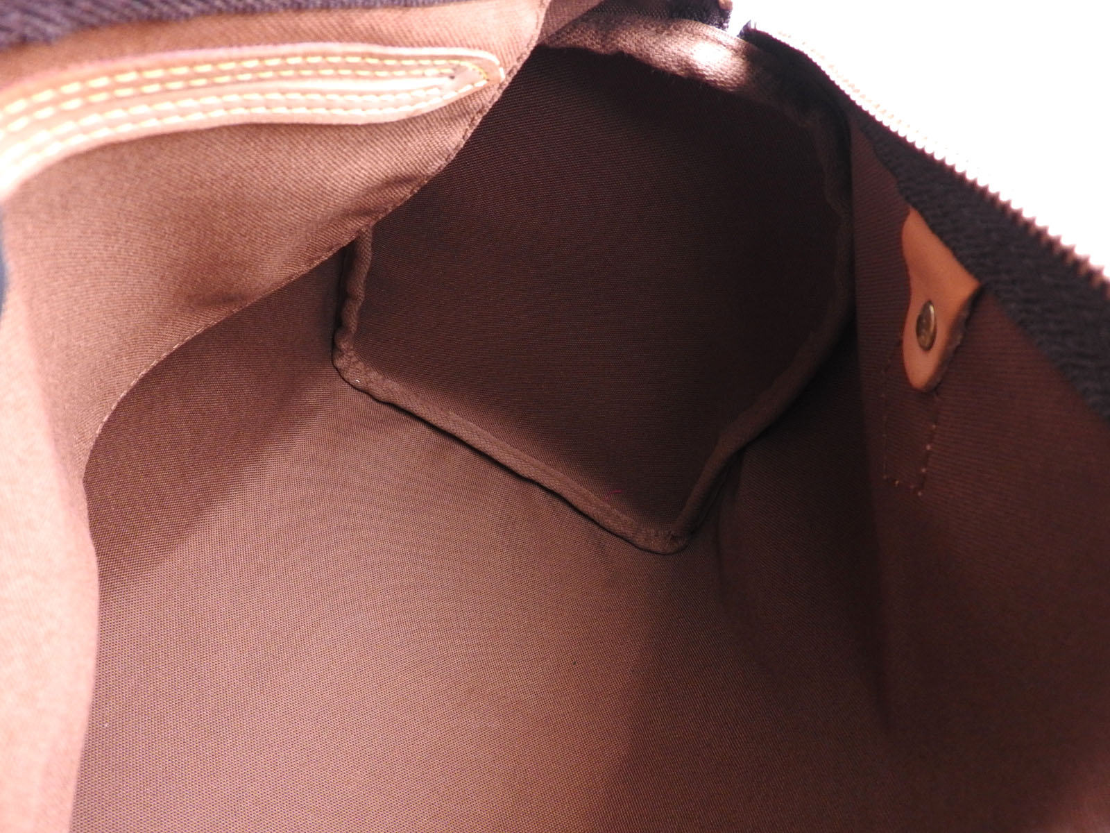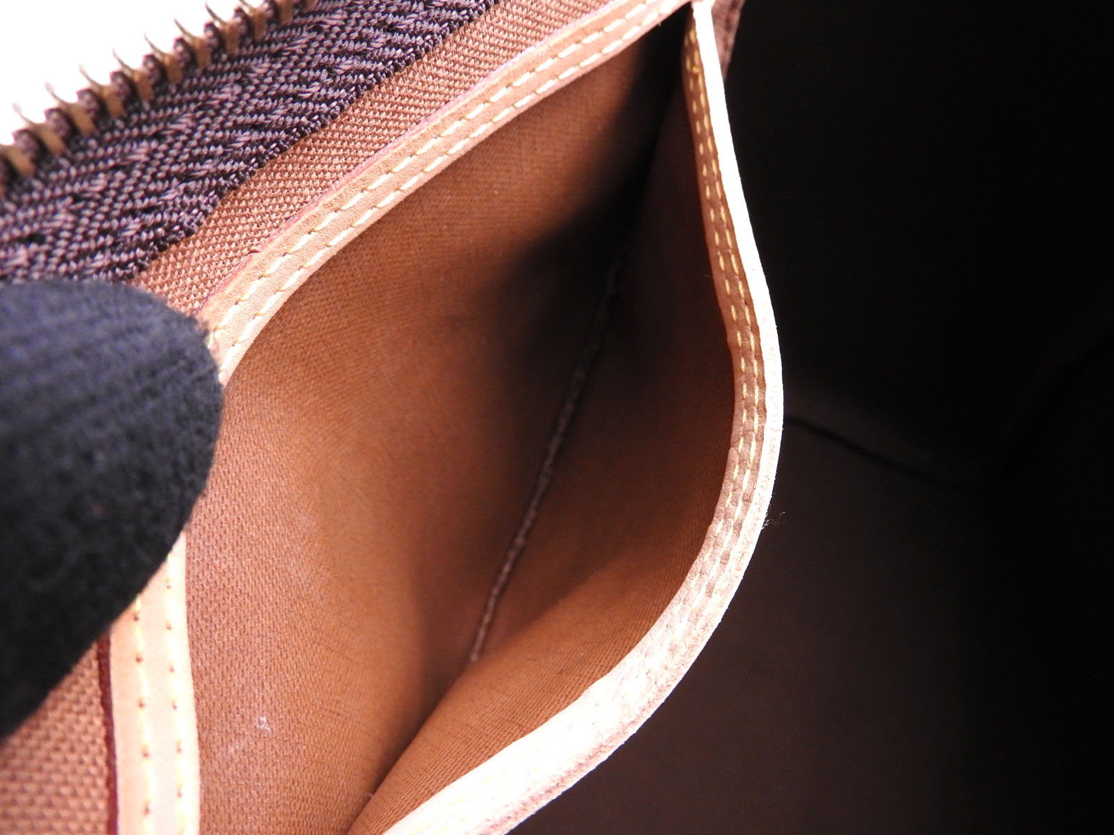 Monogram canvas: Barely used feeling. Slight wrinkles. Leather: Slightly used feeling. Slightly tanned. Small stains, scuffs and wrinkles. |