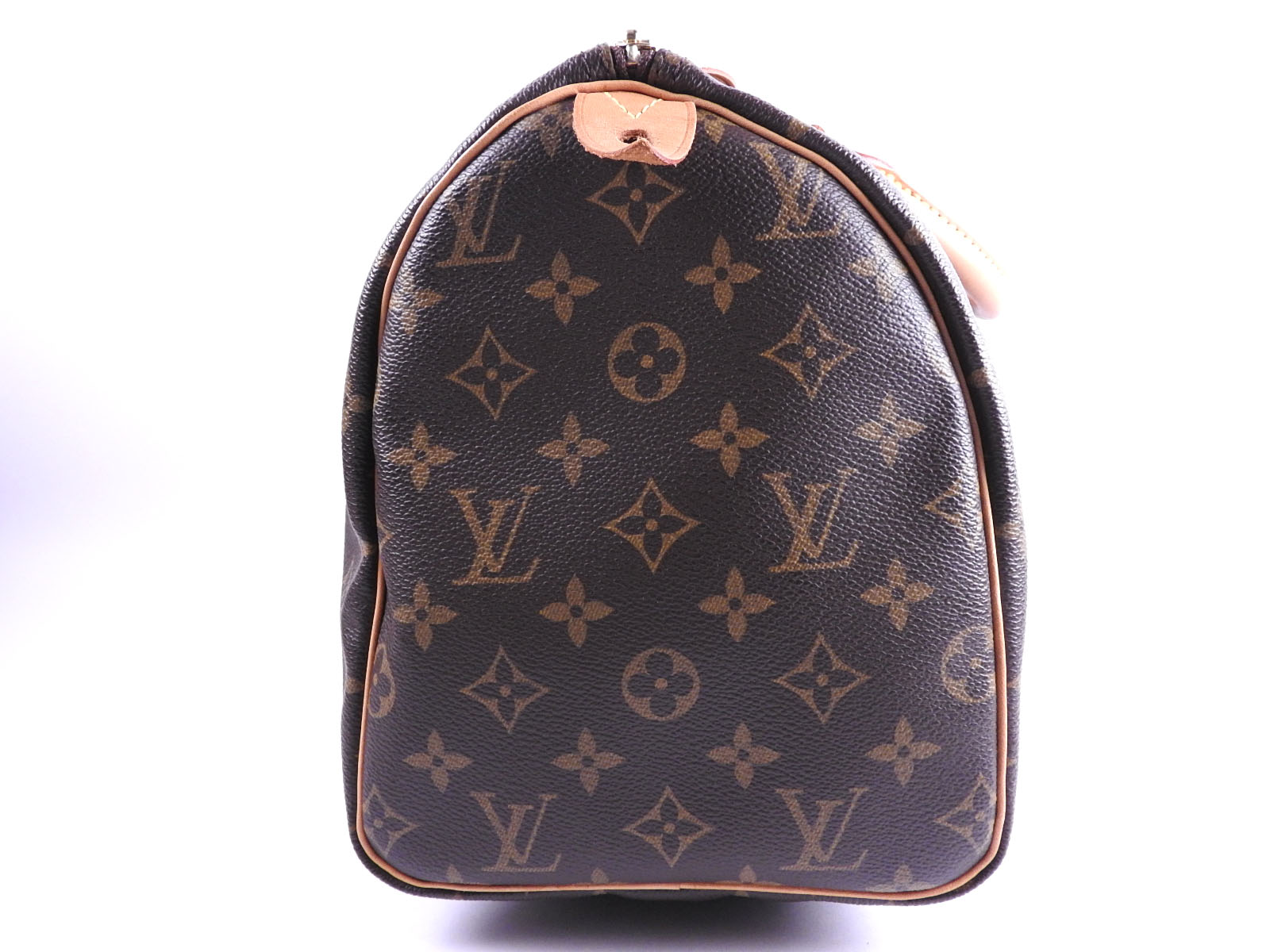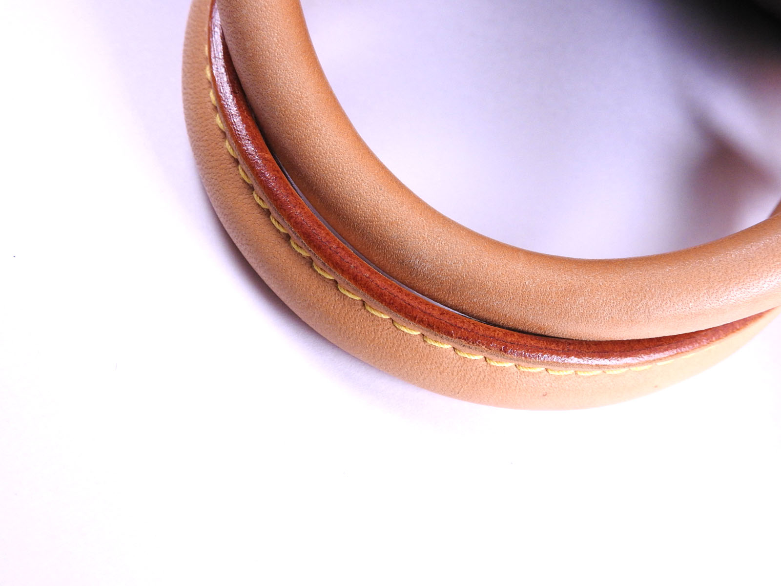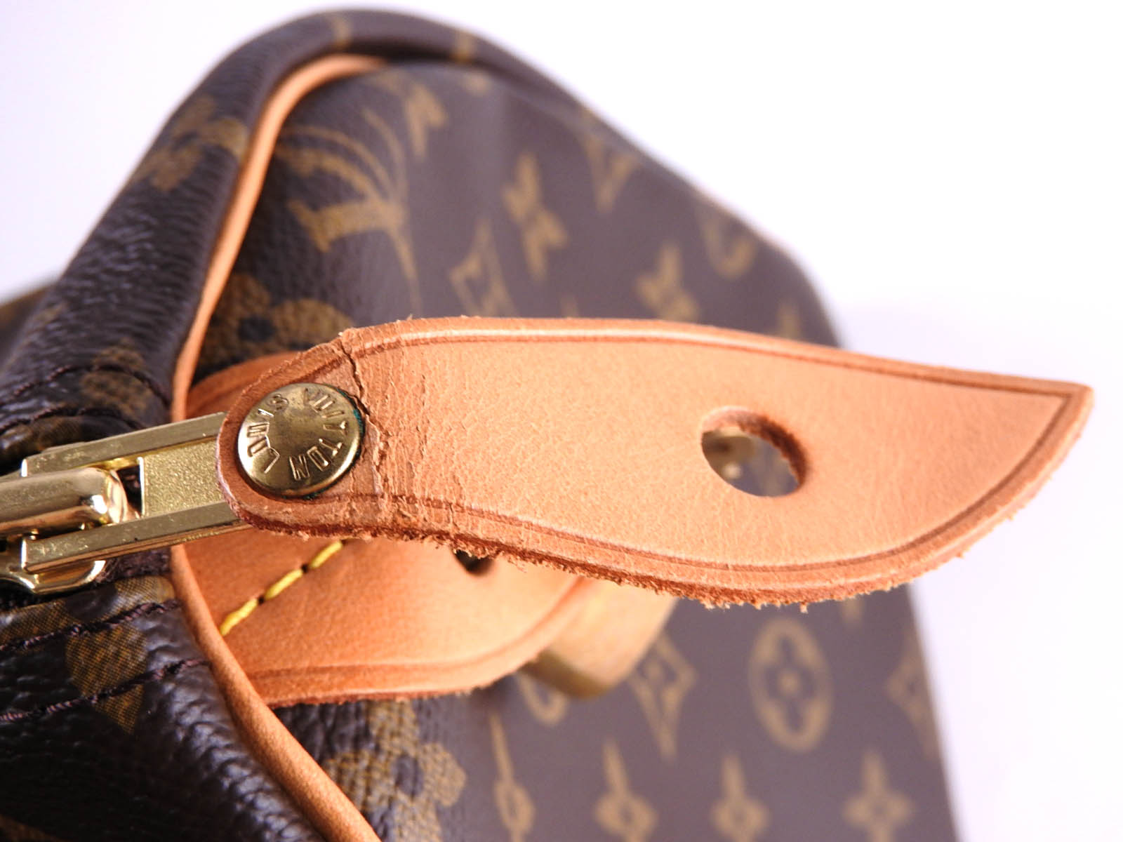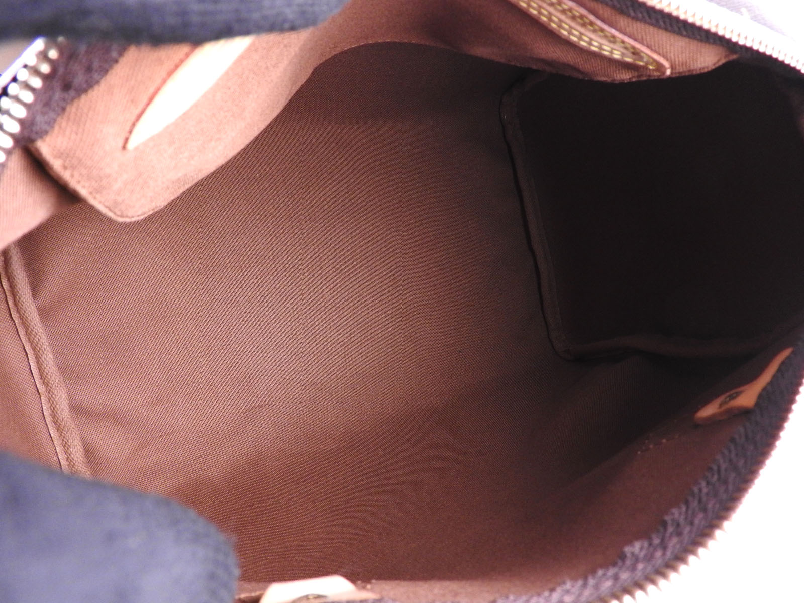 Monogram canvas: Barely used feeling. Slight wrinkles. Leather: Slightly used feeling. Slightly tanned. Small stains, scuffs and wrinkles. |