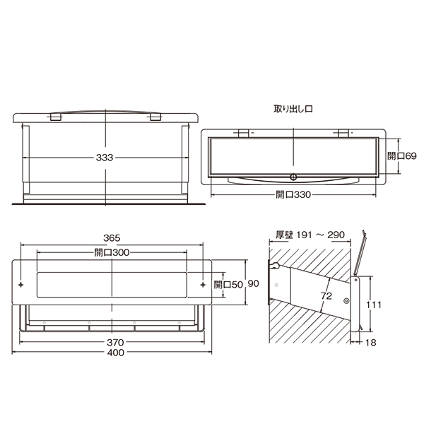 ●スペック:受口部:幅(mm)400 高さ(mm)90 取出し口開口寸法:幅(mm)330 高さ(mm)69 壁厚調整範囲191~290mm