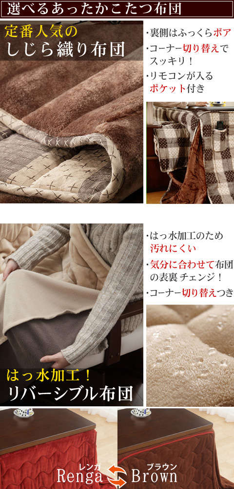 ●材質:こたつ天板-天然木化粧繊維板(楢)、こたつ幕板・脚部-天然木(ラバーウッド)、椅子本体-天然木(ラバーウッド)、布団表地-しじら/綿100%、レンガ・ベージュ/ポリエステル100%(撥水フランネル)