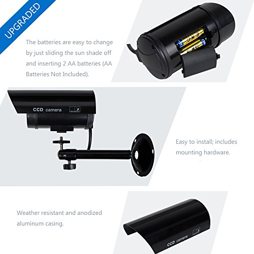 -. Feature : Made of high quality and durable material,Compact design and easy to install,Appear to work as an actual security camera / Cheap and effective way to deter criminals,Installed quickly and easily to the ceiling or wall using the included screws, No wiring is required,2 pcs AA batteries operated (not included) / Protect your homes, shops and business,Suitable for both indoor and outdoor usage, Mix dummy and real cameras to increase your security value,Increase your security at a fraction cost of real cameras, / The inexpensive solution for security theft problems with high professional imitation,No motorized pan movement,Activation light,With elegant and contemporary design, this camera is very popular / Package Includes:4 x WALI Dummy Camera, 12 x Screw, 4 X Warning Security Alert Sticker Decal