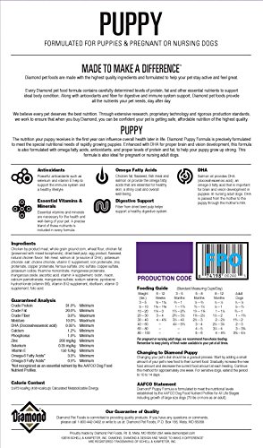 -. Binding : Misc. -. Brand : Diamond Pet Foods -. EAN : 0074198002405 -. Feature : The nutrition your puppy receives in the first year can influence overall health later in life. / Diamond Puppy Formula is precisely formulated to meet the special nutritional needs of rapidly growing puppies. / Enhanced with DHA for proper brain and vision development. / Formulated with omega fatty acids, antioxidants, and proper levels of protein and fat, to help your puppy grow up strong. / This formula is also ideal for pregnant or nursing adult dogs. -. Label : Diamond Pet Foods -. Manufacturer : Diamond Pet Foods -. Model : 74198002405 -. MPN : 74198002405 -. NumberOfItems : 1 -. PackageQuantity : 1 -. PartNumber : 74198002405 -. ProductGroup : Pet Products -. ProductTypeName : PET_SUPPLIES -. Publisher : Diamond Pet Foods -. Size : 40-Pound Bag -. Studio : Diamond Pet Foods -. Title : Diamond Chicken Flavor Dry Dog Food for Puppy, 40-Pound Bag -. UPC : 074198002405